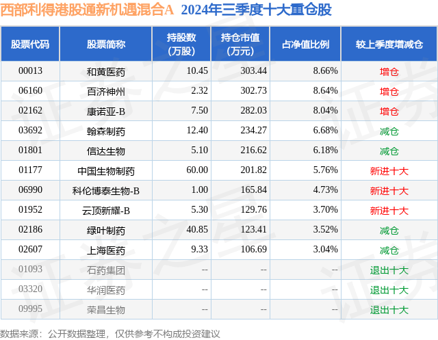 从基金规模来看,西部利得港股通新机遇混合A基金2024年三季度公布的基金规模为0.19亿元,较上一期规模1597.93万元变化了296.23万元,环比变化了18.54%。该基金最新一期资产配置为:股票占净值比92.18%,债券占净值比2.9%,现金占净值比8.85%。从基金持仓来看,该基金当季前十大股票仓位达58.95%,第一大重仓股为和黄医药(00013),持仓占比为8.66%。