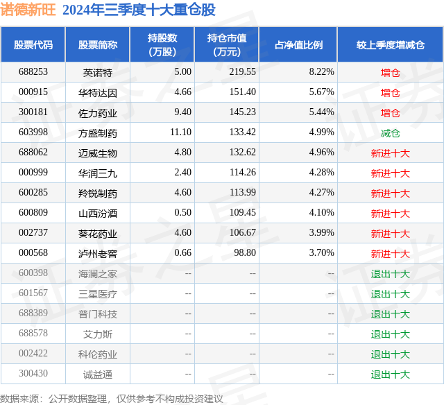 从基金规模来看,诺德新旺基金2024年三季度公布的基金规模为0.27亿元,较上一期规模2614.18万元变化了57.88万元,环比变化了2.21%。该基金最新一期资产配置为:股票占净值比94.4%,债券占净值比0.03%,现金占净值比5.6%。从基金持仓来看,该基金当季前十大股票仓位达49.62%,第一大重仓股为英诺特(688253),持仓占比为8.22%。