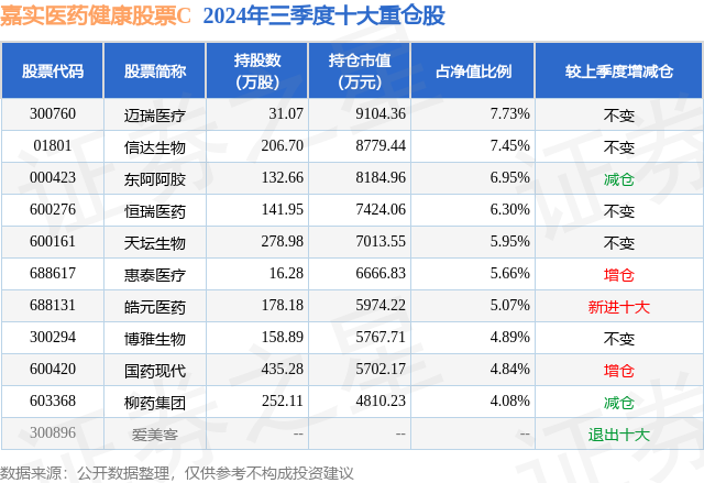 从基金规模来看,嘉实医药健康股票C基金2024年三季度公布的基金规模为2.48亿元,较上一期规模2.3亿元变化了1805.78万元,环比变化了7.87%。该基金最新一期资产配置为:股票占净值比92.39%,债券占净值比4.73%,现金占净值比3.09%。从基金持仓来看,该基金当季前十大股票仓位达58.92%,第一大重仓股为迈瑞医疗(300760),持仓占比为7.73%。