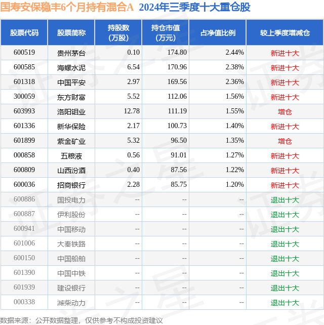 从基金规模来看,国寿安保稳丰6个月持有混合A基金2024年三季度公布的基金规模为0.4亿元,较上一期规模4514.65万元变化了-549.56万元,环比变化了-12.17%。该基金最新一期资产配置为:股票占净值比29.38%,债券占净值比43.69%,现金占净值比5.03%。从基金持仓来看,该基金当季前十大股票仓位达16.73%,第一大重仓股为贵州茅台(600519),持仓占比为2.44%。