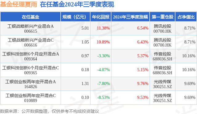 工银科技创新6个月定开混合C现任基金经理为夏雨。其中在任基金经理夏雨已从业5年又43天,2021年12月7日正式接手管理工银科技创新6个月定开混合C,任职期间累计回报为-41.95%。目前还管理着6只基金产品(包括A类和C类),其中本季度表现最佳的基金为工银创业板两年定开混合A(164826),季度净值涨幅为9.76%。