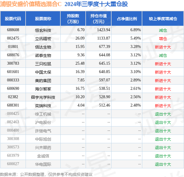 从基金规模来看,浦银安盛价值精选混合C基金2024年三季度公布的基金规模为0.31亿元,较上一期规模3096.92万元变化了-30.04万元,环比变化了-0.97%。该基金最新一期资产配置为:股票占净值比82.76%,无债券类资产,现金占净值比19.74%。从基金持仓来看,该基金当季前十大股票仓位达35.54%,第一大重仓股为恒玄科技(688608),持仓占比为6.89%。