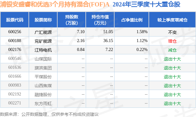 从基金规模来看,浦银安盛睿和优选3个月持有混合(FOF)A基金2024年三季度公布的基金规模为0.19亿元,较上一期规模2115.57万元变化了-203.72万元,环比变化了-9.63%。该基金最新一期资产配置为:股票占净值比2.92%,债券占净值比5.03%,现金占净值比4.24%。从基金持仓来看,该基金当季前十大股票仓位达2.92%,第一大重仓股为广汇能源(600256),持仓占比为1.58%。