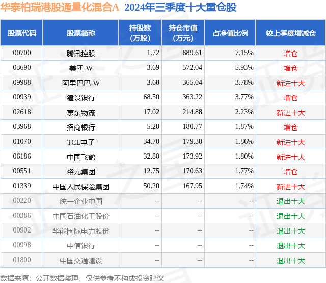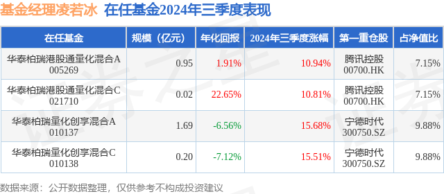 证券之星消息,日前华泰柏瑞港股通量化混合A基金公布三季报,2024年三季度最新规模0.95亿元,季度净值涨幅为10.94%。