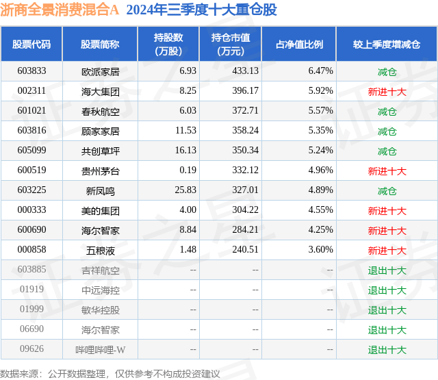 从基金规模来看,浙商全景消费混合A基金2024年三季度公布的基金规模为0.6亿元,较上一期规模9915.79万元变化了-3920.75万元,环比变化了-39.54%。该基金最新一期资产配置为:股票占净值比91.84%,无债券类资产,现金占净值比33.54%。从基金持仓来看,该基金当季前十大股票仓位达50.8%,第一大重仓股为欧派家居(603833),持仓占比为6.47%。