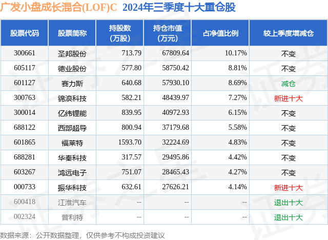 从基金规模来看,广发小盘成长混合(LOF)C基金2024年三季度公布的基金规模为5.89亿元,较上一期规模4.5亿元变化了1.39亿元,环比变化了30.85%。该基金最新一期资产配置为:股票占净值比94.4%,无债券类资产,现金占净值比5.31%。从基金持仓来看,该基金当季前十大股票仓位达64.33%,第一大重仓股为圣邦股份(300661),持仓占比为10.17%。