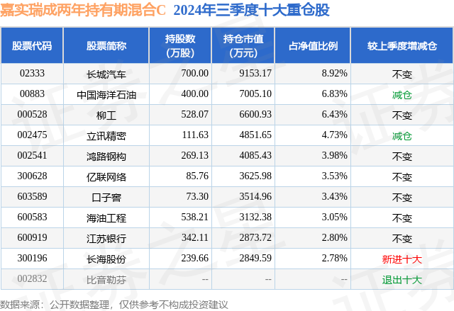 从基金规模来看,嘉实瑞成两年持有期混合C基金2024年三季度公布的基金规模为2.03亿元,较上一期规模1.94亿元变化了908.29万元,环比变化了4.68%。该基金最新一期资产配置为:股票占净值比88.35%,债券占净值比0.37%,现金占净值比9.53%。从基金持仓来看,该基金当季前十大股票仓位达46.48%,第一大重仓股为长城汽车(02333),持仓占比为8.92%。