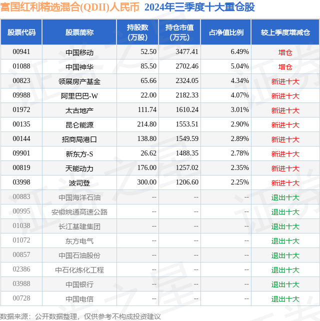 从基金规模来看,富国红利精选混合(QDII)人民币基金2024年三季度公布的基金规模为5.36亿元,较上一期规模4.2亿元变化了1.15亿元,环比变化了27.43%。该基金最新一期资产配置为:股票占净值比70.58%,债券占净值比0.01%,现金占净值比20.56%。从基金持仓来看,该基金当季前十大股票仓位达36.12%,第一大重仓股为中国移动(00941),持仓占比为6.49%。