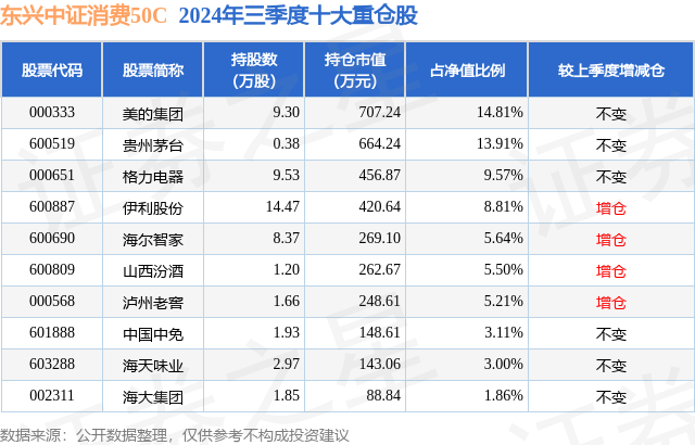 从基金规模来看,东兴中证消费50C基金2024年三季度公布的基金规模为0.19亿元,较上一期规模1627.82万元变化了229.17万元,环比变化了14.08%。该基金最新一期资产配置为:股票占净值比94.0%,债券占净值比5.27%,现金占净值比0.23%。从基金持仓来看,该基金当季前十大股票仓位达71.42%,第一大重仓股为美的集团(000333),持仓占比为14.81%。