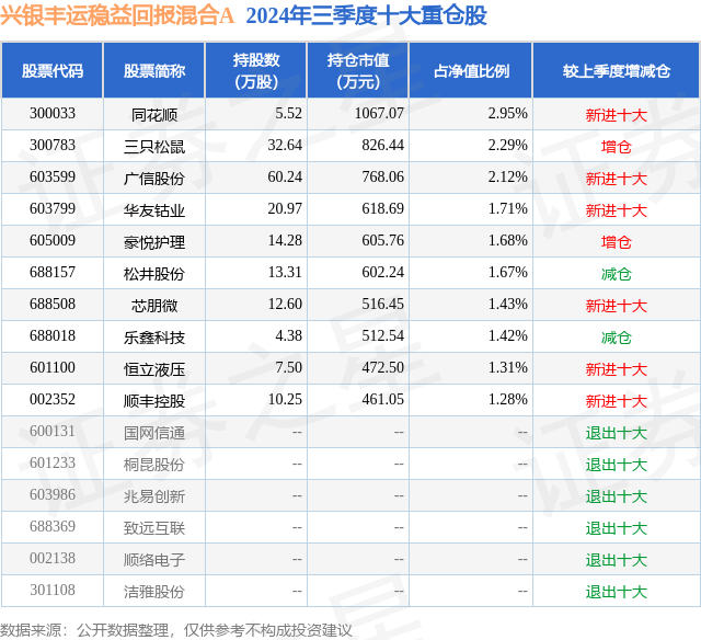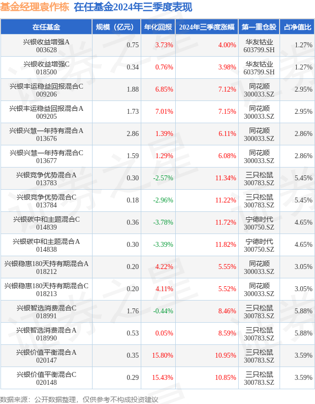 证券之星消息,日前兴银丰运稳益回报混合A基金公布三季报,2024年三季度最新规模1.73亿元,季度净值涨幅为7.15%。