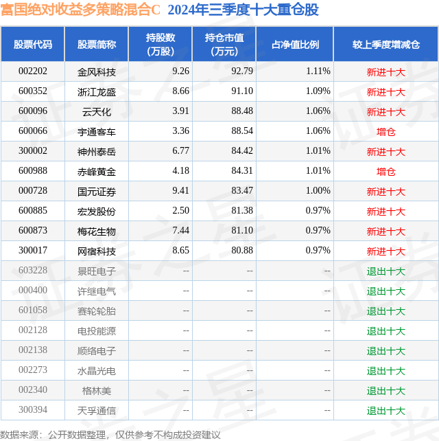 从基金规模来看,富国绝对收益多策略混合C基金2024年三季度公布的基金规模为0.23亿元,较上一期规模2419.91万元变化了-93.36万元,环比变化了-3.86%。该基金最新一期资产配置为:股票占净值比85.09%,无债券类资产,现金占净值比1.9%。从基金持仓来看,该基金当季前十大股票仓位达10.25%,第一大重仓股为金风科技(002202),持仓占比为1.11%。