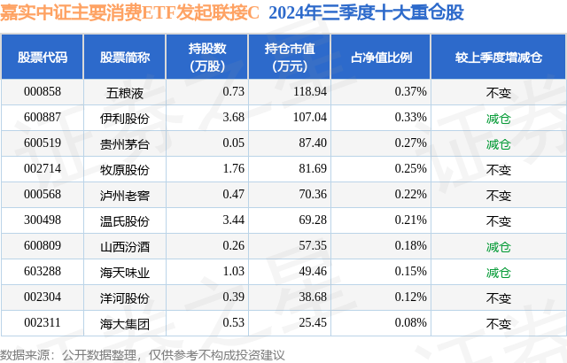 从基金规模来看,嘉实中证主要消费ETF发起联接C基金2024年三季度公布的基金规模为2.2亿元,较上一期规模1.79亿元变化了4179.93万元,环比变化了23.41%。该基金最新一期资产配置为:股票占净值比3.14%,无债券类资产,现金占净值比6.19%。从基金持仓来看,该基金当季前十大股票仓位达2.18%,第一大重仓股为五粮液(000858),持仓占比为0.37%。