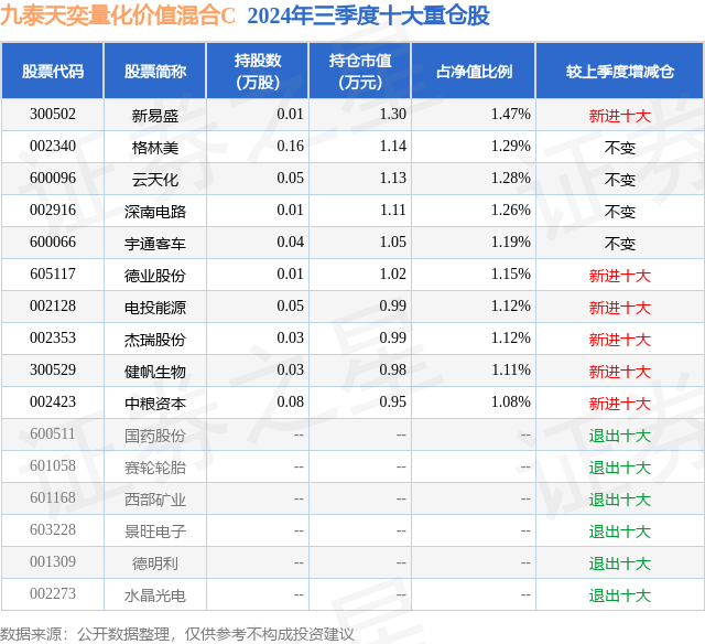 从基金规模来看,九泰天奕量化价值混合C基金2024年三季度公布的基金规模为0.0亿元,较上一期规模18.57万元变化了-0.15万元,环比变化了-0.82%。该基金最新一期资产配置为:股票占净值比91.76%,无债券类资产,现金占净值比9.77%。从基金持仓来看,该基金当季前十大股票仓位达12.07%,第一大重仓股为新易盛(300502),持仓占比为1.47%。