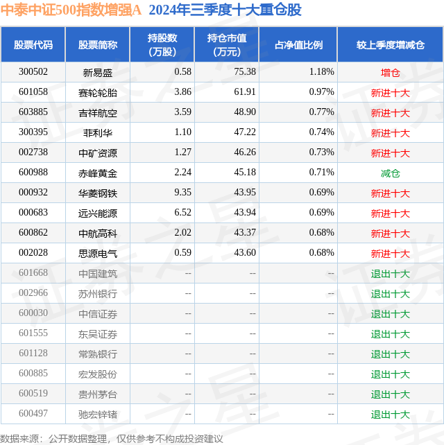 从基金规模来看,中泰中证500指数增强A基金2024年三季度公布的基金规模为0.19亿元,较上一期规模1458.51万元变化了481.39万元,环比变化了33.01%。该基金最新一期资产配置为:股票占净值比91.66%,无债券类资产,现金占净值比7.87%。从基金持仓来看,该基金当季前十大股票仓位达7.84%,第一大重仓股为新易盛(300502),持仓占比为1.18%。