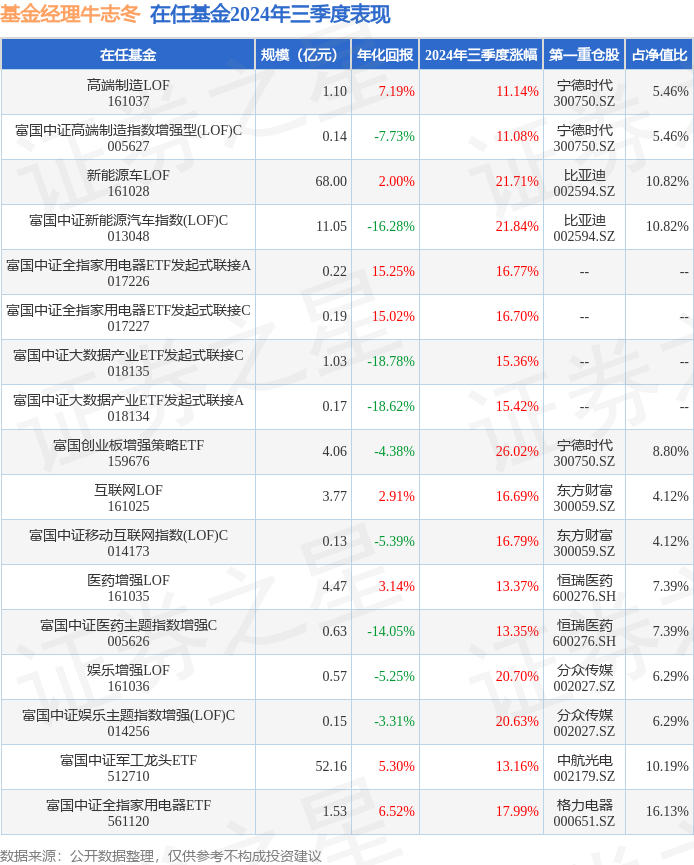从基金规模来看,富国中证高端制造指数增强型(LOF)C基金2024年三季度公布的基金规模为0.14亿元,较上一期规模1155.02万元变化了227.05万元,环比变化了19.66%。该基金最新一期资产配置为:股票占净值比94.16%,无债券类资产,现金占净值比5.47%。从基金持仓来看,该基金当季前十大股票仓位达19.81%,第一大重仓股为宁德时代(300750),持仓占比为5.46%。