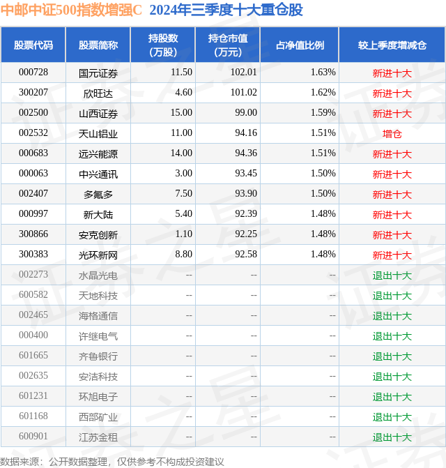 从基金规模来看,中邮中证500指数增强C基金2024年三季度公布的基金规模为0.32亿元,较上一期规模2671.86万元变化了502.92万元,环比变化了18.82%。该基金最新一期资产配置为:股票占净值比94.19%,无债券类资产,现金占净值比5.44%。从基金持仓来看,该基金当季前十大股票仓位达15.3%,第一大重仓股为国元证券(000728),持仓占比为1.63%。