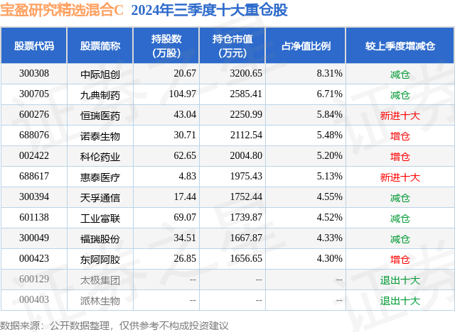 从基金规模来看,宝盈研究精选混合C基金2024年三季度公布的基金规模为0.77亿元,较上一期规模7475.59万元变化了198.77万元,环比变化了2.66%。该基金最新一期资产配置为:股票占净值比93.9%,无债券类资产,现金占净值比7.36%。从基金持仓来看,该基金当季前十大股票仓位达54.37%,第一大重仓股为中际旭创(300308),持仓占比为8.31%。