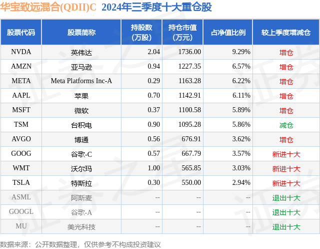 从基金规模来看,华宝致远混合(QDII)C基金2024年三季度公布的基金规模为1.18亿元,较上一期规模9478.85万元变化了2329.37万元,环比变化了24.57%。该基金最新一期资产配置为:股票占净值比74.69%,无债券类资产,现金占净值比9.96%。从基金持仓来看,该基金当季前十大股票仓位达53.1%,第一大重仓股为英伟达(NVDA),持仓占比为9.29%。