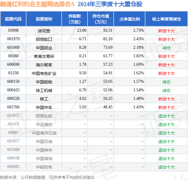 从基金规模来看,融通红利机会主题精选混合A基金2024年三季度公布的基金规模为0.32亿元,较上一期规模3205.11万元变化了-10.51万元,环比变化了-0.33%。该基金最新一期资产配置为:股票占净值比89.77%,债券占净值比13.14%,现金占净值比9.33%。从基金持仓来看,该基金当季前十大股票仓位达18.49%,第一大重仓股为波司登(03998),持仓占比为2.73%。