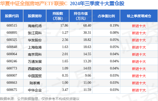 从基金规模来看,华夏中证全指房地产ETF联接C基金2024年三季度公布的基金规模为2.06亿元,较上一期规模1.29亿元变化了7666.17万元,环比变化了59.45%。该基金最新一期资产配置为:股票占净值比0.81%,无债券类资产,现金占净值比8.78%。从基金持仓来看,该基金当季前十大股票仓位达0.58%,第一大重仓股为海南机场(600515),持仓占比为0.19%。