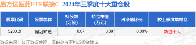 从基金规模来看,易方达医药ETF联接C基金2024年三季度公布的基金规模为6.97亿元,较上一期规模5.58亿元变化了1.4亿元,环比变化了25.04%。该基金最新一期资产配置为:无股票类资产,债券占净值比1.72%,现金占净值比3.21%。从基金持仓来看,该基金当季前十大股票仓位达0.0%,第一大重仓股为铜冠矿建(920019),持仓占比为0.0%。
