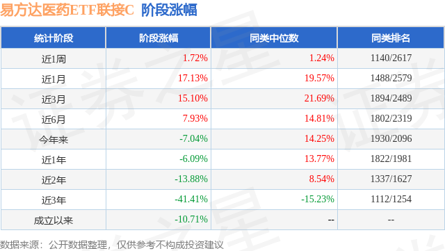 从业绩表现来看,易方达医药ETF联接C基金过去一年净值涨幅为-6.09%,在同类基金中排名1822/1981,同类基金过去一年净值涨幅中位数为13.77%。而基金过去一年的最大回撤为-29.61%,成立以来的最大回撤为-63.53%。