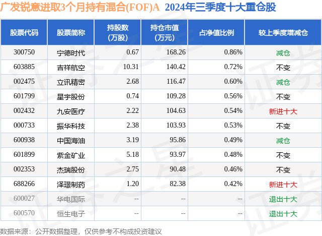 从基金规模来看,广发锐意进取3个月持有混合(FOF)A基金2024年三季度公布的基金规模为1.02亿元,较上一期规模9609.19万元变化了585.19万元,环比变化了6.09%。该基金最新一期资产配置为:股票占净值比6.99%,债券占净值比3.83%,现金占净值比1.48%。从基金持仓来看,该基金当季前十大股票仓位达5.66%,第一大重仓股为宁德时代(300750),持仓占比为0.86%。