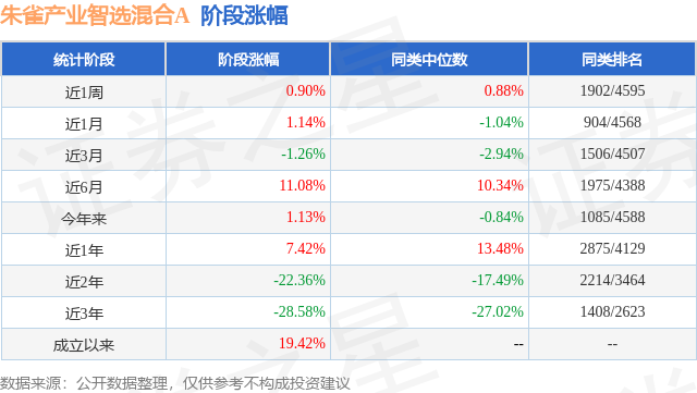 从业绩表现来看,朱雀产业智选混合A基金过去一年净值涨幅为-0.33%,在同类基金中排名3094/3979,同类基金过去一年净值涨幅中位数为5.4%。而基金过去一年的最大回撤为-22.52%,成立以来的最大回撤为-48.13%。
