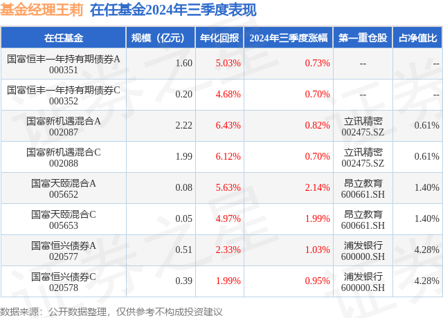 证券之星消息,日前国富天颐混合C基金公布三季报,2024年三季度最新规模0.05亿元,季度净值涨幅为1.99%。