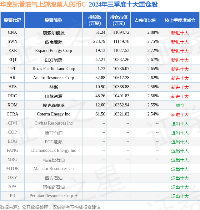 从基金规模来看,华宝标普油气上游股票人民币C基金2024年三季度公布的基金规模为18.95亿元,较上一期规模18.72亿元变化了2232.4万元,环比变化了1.19%。该基金最新一期资产配置为:股票占净值比95.25%,无债券类资产,现金占净值比8.1%。从基金持仓来看,该基金当季前十大股票仓位达26.5%,第一大重仓股为康索尔能源(CNX),持仓占比为2.88%。