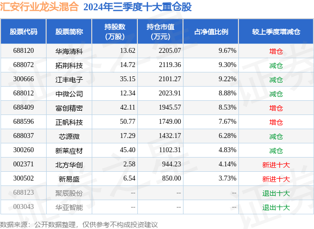 从基金规模来看,汇安行业龙头混合基金2024年三季度公布的基金规模为2.28亿元,较上一期规模1.97亿元变化了3106.9万元,环比变化了15.78%。该基金最新一期资产配置为:股票占净值比93.08%,无债券类资产,现金占净值比6.85%。从基金持仓来看,该基金当季前十大股票仓位达72.25%,第一大重仓股为华海清科(688120),持仓占比为9.67%。