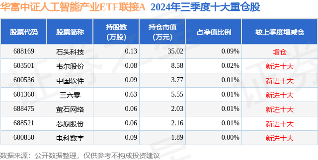 从基金规模来看,华富中证人工智能产业ETF联接A基金2024年三季度公布的基金规模为2.25亿元,较上一期规模1.9亿元变化了3549.11万元,环比变化了18.72%。该基金最新一期资产配置为:股票占净值比0.15%,无债券类资产,现金占净值比5.17%。从基金持仓来看,该基金当季前十大股票仓位达0.15%,第一大重仓股为石头科技(688169),持仓占比为0.09%。