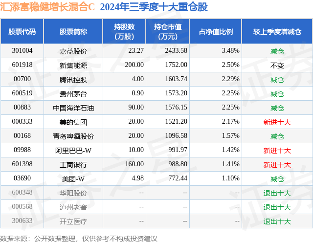 从基金规模来看,汇添富稳健增长混合C基金2024年三季度公布的基金规模为2.71亿元,较上一期规模2.78亿元变化了-693.82万元,环比变化了-2.5%。该基金最新一期资产配置为:股票占净值比22.02%,债券占净值比92.82%,现金占净值比3.73%。从基金持仓来看,该基金当季前十大股票仓位达20.44%,第一大重仓股为嘉益股份(301004),持仓占比为3.48%。