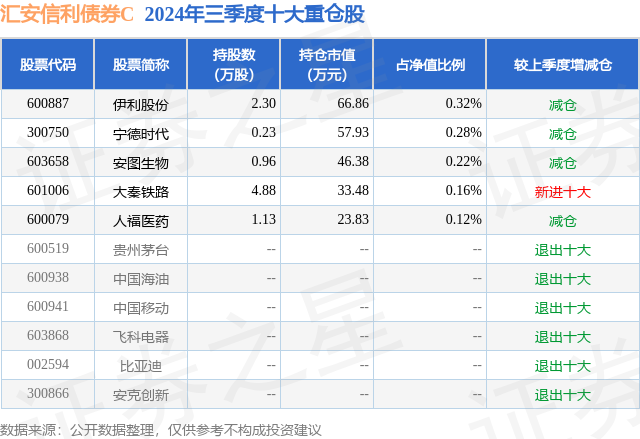 从基金规模来看,汇安信利债券C基金2024年三季度公布的基金规模为0.5亿元,较上一期规模5643.01万元变化了-598.83万元,环比变化了-10.61%。该基金最新一期资产配置为:股票占净值比1.1%,债券占净值比94.25%,现金占净值比0.97%。从基金持仓来看,该基金当季前十大股票仓位达1.1%,第一大重仓股为伊利股份(600887),持仓占比为0.32%。