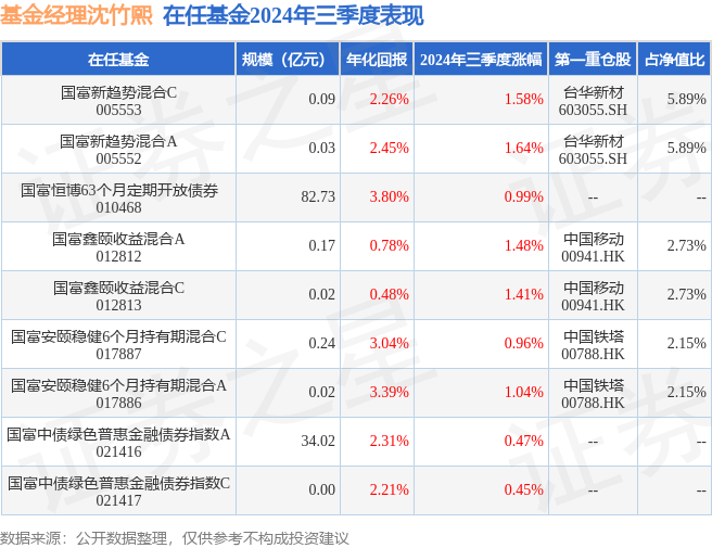 证券之星消息,日前国富新趋势混合C基金公布三季报,2024年三季度最新规模0.09亿元,季度净值涨幅为1.58%。