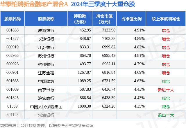 从基金规模来看,华泰柏瑞新金融地产混合A基金2024年三季度公布的基金规模为6.66亿元,较上一期规模5.82亿元变化了8412.5万元,环比变化了14.45%。该基金最新一期资产配置为:股票占净值比94.44%,无债券类资产,现金占净值比7.75%。从基金持仓来看,该基金当季前十大股票仓位达46.75%,第一大重仓股为成都银行(601838),持仓占比为4.91%。