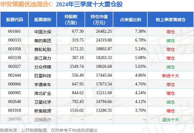 从基金规模来看,华安策略优选混合C基金2024年三季度公布的基金规模为0.03亿元,较上一期规模265.24万元变化了33.57万元,环比变化了12.66%。该基金最新一期资产配置为:股票占净值比86.99%,债券占净值比0.57%,现金占净值比13.0%。从基金持仓来看,该基金当季前十大股票仓位达51.19%,第一大重仓股为中国太保(601601),持仓占比为7.38%。
