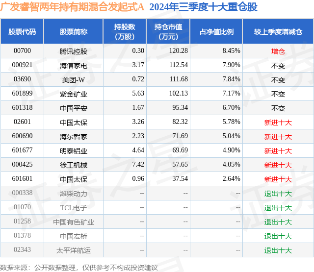 证券之星消息,日前广发睿智两年持有期混合发起式A基金公布三季报,2024年三季度最新规模0.13亿元,季度净值涨幅为4.87%。