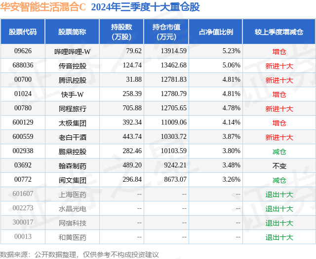 从基金规模来看,华安智能生活混合C基金2024年三季度公布的基金规模为1.71亿元,较上一期规模1.68亿元变化了361.4万元,环比变化了2.16%。该基金最新一期资产配置为:股票占净值比90.68%,无债券类资产,现金占净值比9.36%。从基金持仓来看,该基金当季前十大股票仓位达43.24%,第一大重仓股为哔哩哔哩-W(09626),持仓占比为5.23%。