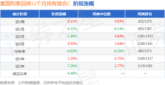 从业绩表现来看,富国利享回报12个月持有混合C基金过去一年净值涨幅为0.69%,在同类基金中排名1196/1322,同类基金过去一年净值涨幅中位数为4.43%。而基金过去一年的最大回撤为-5.97%,成立以来的最大回撤为-11.12%。