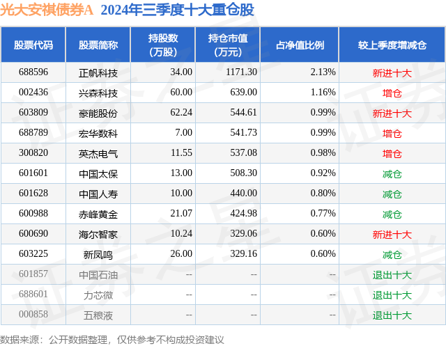 从基金规模来看,光大安祺债券A基金2024年三季度公布的基金规模为5.47亿元,较上一期规模7.6亿元变化了-2.14亿元,环比变化了-28.09%。该基金最新一期资产配置为:股票占净值比15.94%,债券占净值比81.8%,现金占净值比18.81%。从基金持仓来看,该基金当季前十大股票仓位达9.94%,第一大重仓股为正帆科技(688596),持仓占比为2.13%。