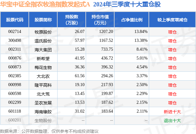 从基金规模来看,华宝中证全指农牧渔指数发起式A基金2024年三季度公布的基金规模为0.29亿元,较上一期规模2560.35万元变化了298.31万元,环比变化了11.65%。该基金最新一期资产配置为:股票占净值比94.94%,无债券类资产,现金占净值比7.07%。从基金持仓来看,该基金当季前十大股票仓位达57.6%,第一大重仓股为牧原股份(002714),持仓占比为13.84%。