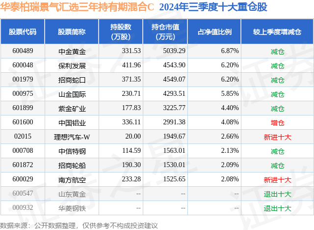 从基金规模来看,华泰柏瑞景气汇选三年持有期混合C基金2024年三季度公布的基金规模为1.54亿元,较上一期规模1.35亿元变化了1964.89万元,环比变化了14.58%。该基金最新一期资产配置为:股票占净值比93.23%,无债券类资产,现金占净值比6.14%。从基金持仓来看,该基金当季前十大股票仓位达42.56%,第一大重仓股为中金黄金(600489),持仓占比为6.87%。