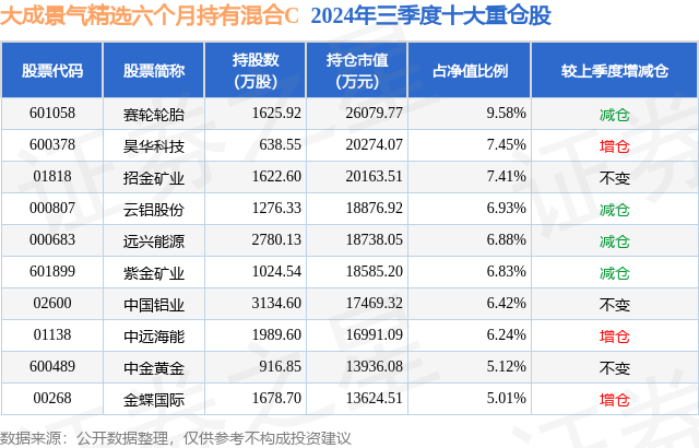 从基金规模来看,大成景气精选六个月持有混合C基金2024年三季度公布的基金规模为3.71亿元,较上一期规模3.63亿元变化了786.07万元,环比变化了2.17%。该基金最新一期资产配置为:股票占净值比94.72%,无债券类资产,现金占净值比5.32%。从基金持仓来看,该基金当季前十大股票仓位达67.87%,第一大重仓股为赛轮轮胎(601058),持仓占比为9.58%。