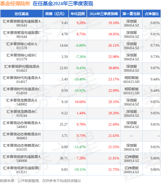 从基金规模来看,汇丰晋信低碳先锋股票C基金2024年三季度公布的基金规模为0.83亿元,较上一期规模6886.85万元变化了1456.94万元,环比变化了21.16%。该基金最新一期资产配置为:股票占净值比93.92%,债券占净值比1.78%,现金占净值比3.5%。从基金持仓来看,该基金当季前十大股票仓位达69.62%,第一大重仓股为亿纬锂能(300014),持仓占比为9.86%。