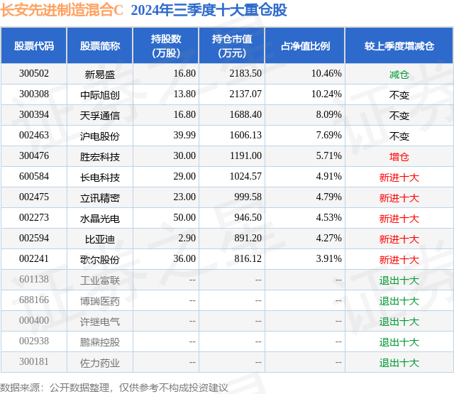 从基金规模来看,长安先进制造混合C基金2024年三季度公布的基金规模为0.42亿元,较上一期规模3565.42万元变化了625.18万元,环比变化了17.53%。该基金最新一期资产配置为:股票占净值比93.22%,无债券类资产,现金占净值比7.88%。从基金持仓来看,该基金当季前十大股票仓位达64.6%,第一大重仓股为新易盛(300502),持仓占比为10.46%。