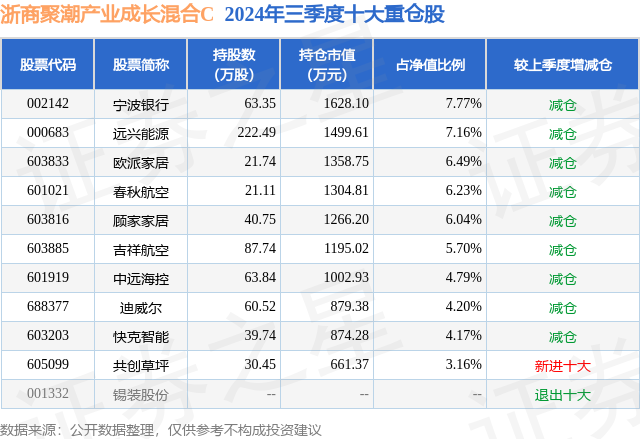 从基金规模来看,浙商聚潮产业成长混合C基金2024年三季度公布的基金规模为0.07亿元,较上一期规模6533.61万元变化了-5844.99万元,环比变化了-89.46%。该基金最新一期资产配置为:股票占净值比90.85%,债券占净值比1.92%,现金占净值比27.92%。从基金持仓来看,该基金当季前十大股票仓位达55.71%,第一大重仓股为宁波银行(002142),持仓占比为7.77%。