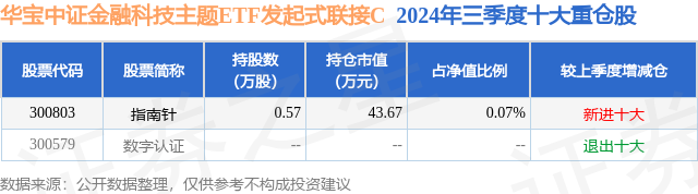 从基金规模来看,华宝中证金融科技主题ETF发起式联接C基金2024年三季度公布的基金规模为4.79亿元,较上一期规模1.15亿元变化了3.63亿元,环比变化了314.77%。该基金最新一期资产配置为:股票占净值比0.07%,无债券类资产,现金占净值比11.19%。从基金持仓来看,该基金当季前十大股票仓位达0.07%,第一大重仓股为指南针(300803),持仓占比为0.07%。