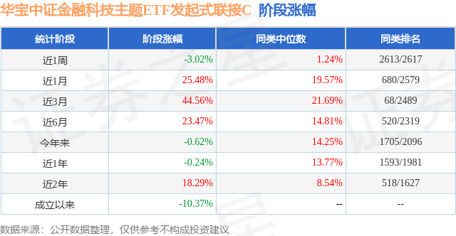 从业绩表现来看,华宝中证金融科技主题ETF发起式联接C基金过去一年净值涨幅为-0.24%,在同类基金中排名1593/1981,同类基金过去一年净值涨幅中位数为13.77%。而基金过去一年的最大回撤为-37.69%,成立以来的最大回撤为-46.31%。