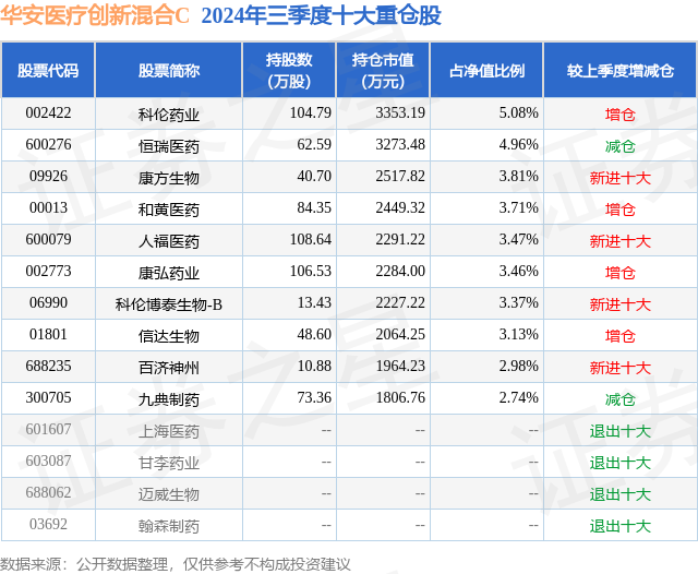 从基金规模来看,华安医疗创新混合C基金2024年三季度公布的基金规模为1.58亿元,较上一期规模1.44亿元变化了1385.31万元,环比变化了9.59%。该基金最新一期资产配置为:股票占净值比90.27%,债券占净值比0.04%,现金占净值比10.48%。从基金持仓来看,该基金当季前十大股票仓位达36.71%,第一大重仓股为科伦药业(002422),持仓占比为5.08%。